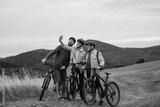 Grandfather, father and teen boy on cycling trip taking selfie.