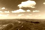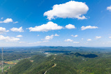 Dahong Mountain landscape stretches under a blue sky with fluffy white clouds.