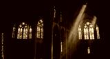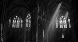 Sunlight streams through ornate stained glass windows illuminating the majestic interior of a gothic cathedral creating a serene and spiritual atmosphere.