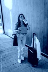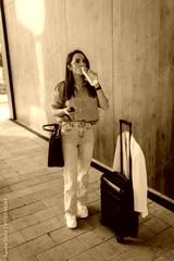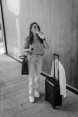 Businesswoman drinking water while waiting with luggage and smartphone