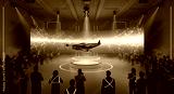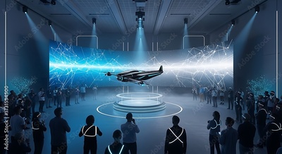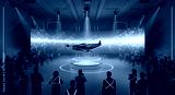 Futuristic drone unveiling captivates audience in stunning high tech presentation with dynamic digital backdrop and professional lighting creating awe