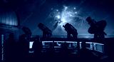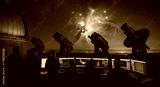 Scientists observing vibrant nebula and stars through telescopes at observatory with city lights below