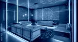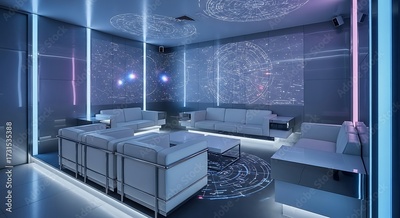 Futuristic lounge immerses guests in a mesmerizing celestial projection room, perfect for innovative meetings or unique entertainment experiences.