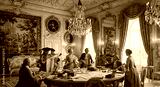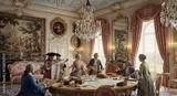 Elegant aristocrats gather in a lavish rococo salon, meticulously studying antique maps and charts around a grand circular table, exuding historical sophistication and intellectual pursuit.