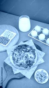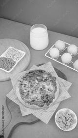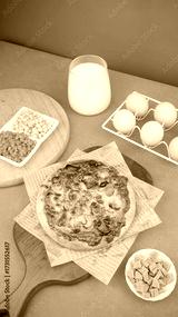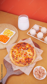 Fresh Homemade Pizza with Baking Ingredients and Milk on Wooden Kitchen Table