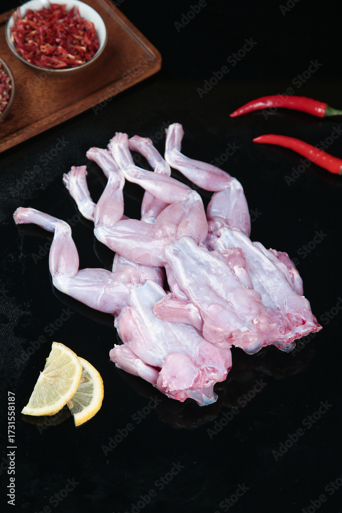 Fresh Raw Frog Legs with Chili Peppers and Spices for Gourmet Cooking