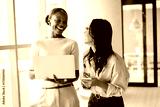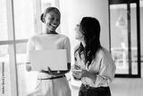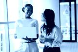 Two businesswomen discussing ideas using a laptop and taking notes in an office