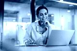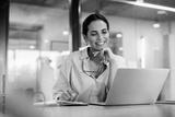 Smiling woman in office using laptop while holding glasses and working thoughtfully
