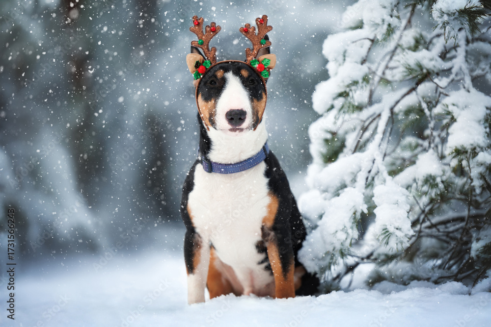 funny bull terrier dog posing for Christmas in the snow in a headband