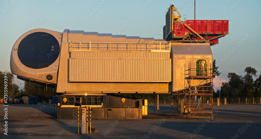 Wind turbine components during the assembly of a complete wind turbine nacelle