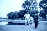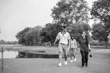 Professional young golfers walk with caddy cross lush green fairway.