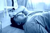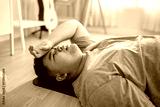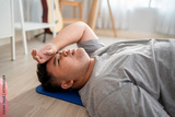 Exhausted Asian plus-size man lying down on a yoga mat after workout.