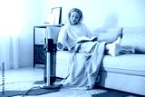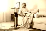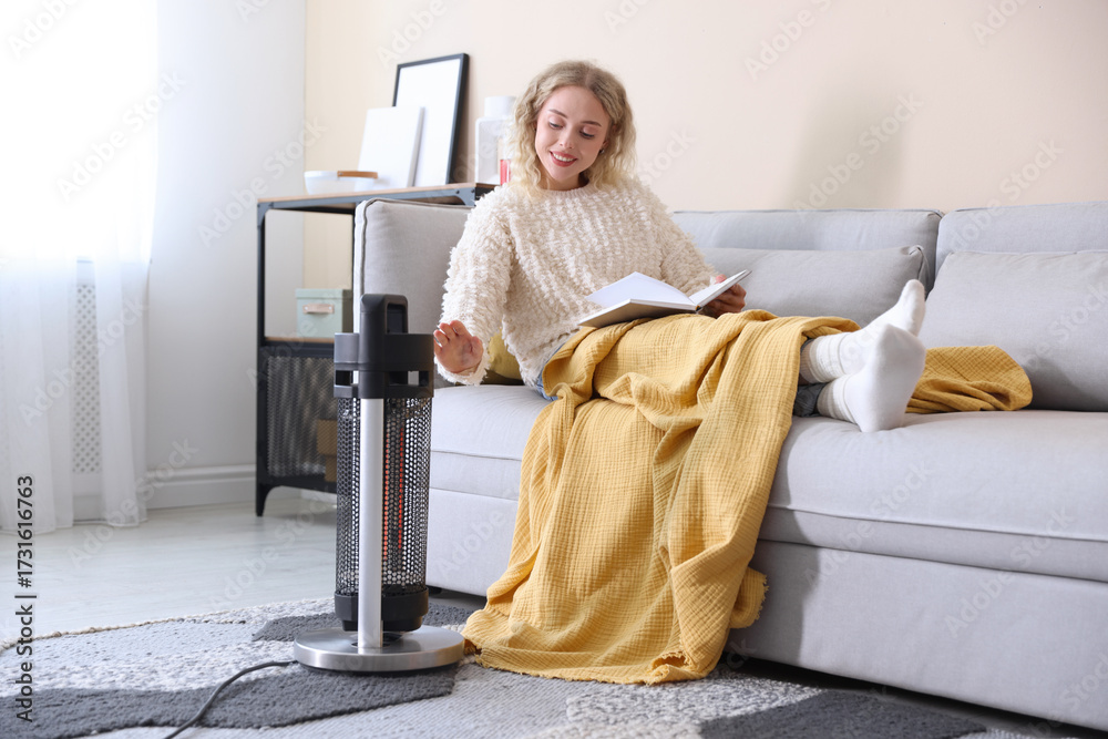 Young woman reading book near electric heater at home