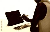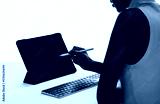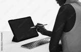 Woman using stylus on digital tablet with keyboard for mockups and creative work