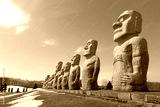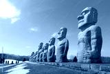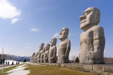Moai, big stone statue in winter with snow on ground at hill of Buddha in Sapporo, Makomanai takino, Japan.