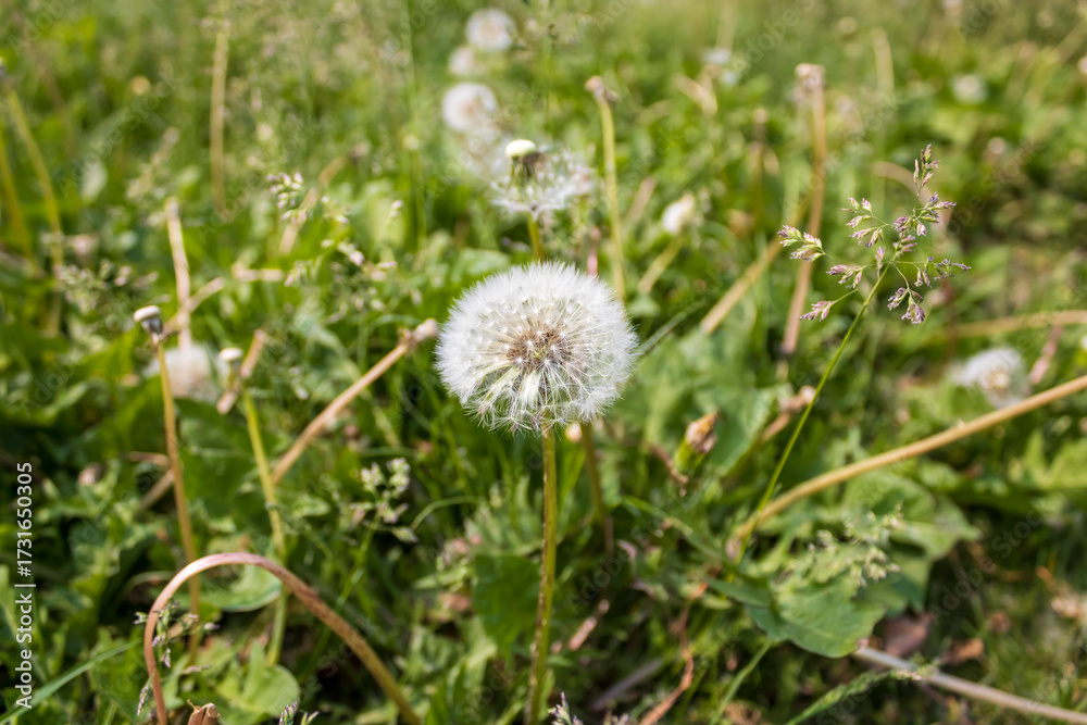 White fluffy dandelions among green wild grass