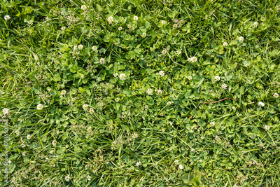Green grass and white clovers texture background