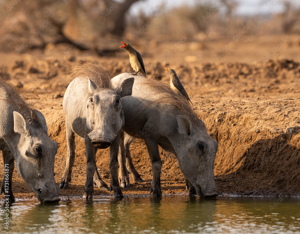 Three warthog piglet having a drink at a waterhole while red-billed oxpeckers sitting on the back of one piglet, Bostwana.