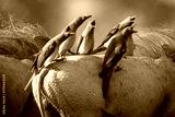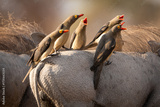 Closeup of red-billed oxpecker sitting on the back of a young warthog, Botswana.