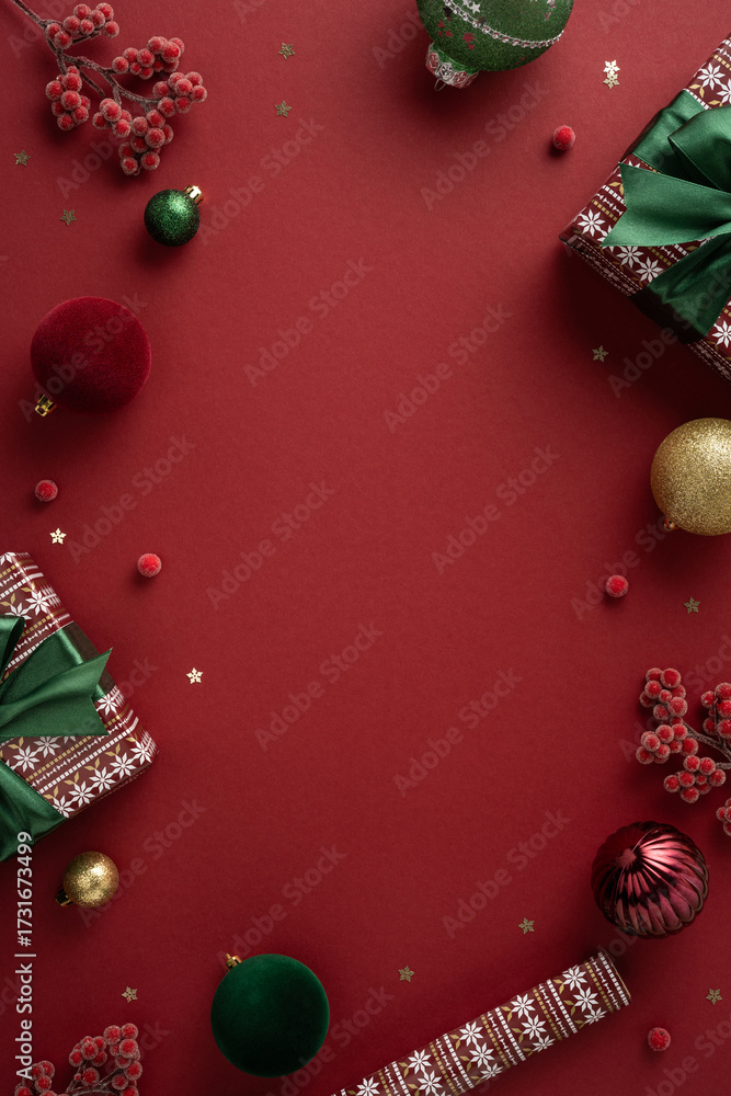 Vibrant vertical Christmas scene featuring wrapped gifts, ornaments, berries, and ribbons on a rich red backdrop, evoking festive warmth, joy, and seasonal greeting for holiday New Year celebrations