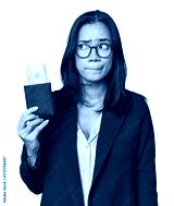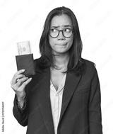 Young Latina in business suit with passport confused, feels doubtful and unsure.