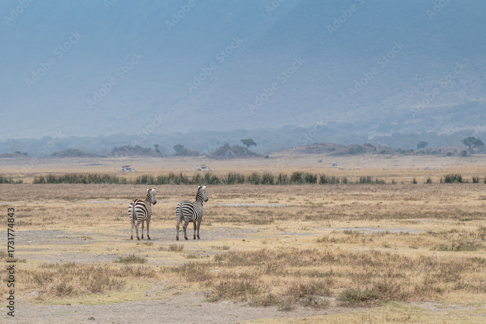 Two Zebra's, in the Ngorongoro Crater, surveying the landscape, with some safari vehicles in the distance