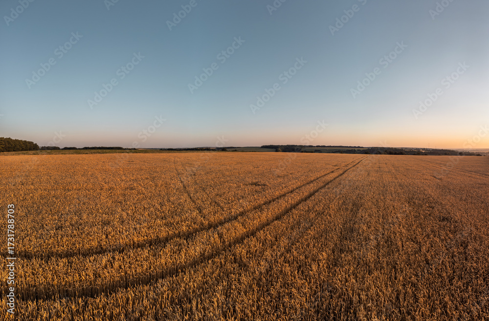 Morning golden wheat field panoramic scenery, agriculture summer harvest season