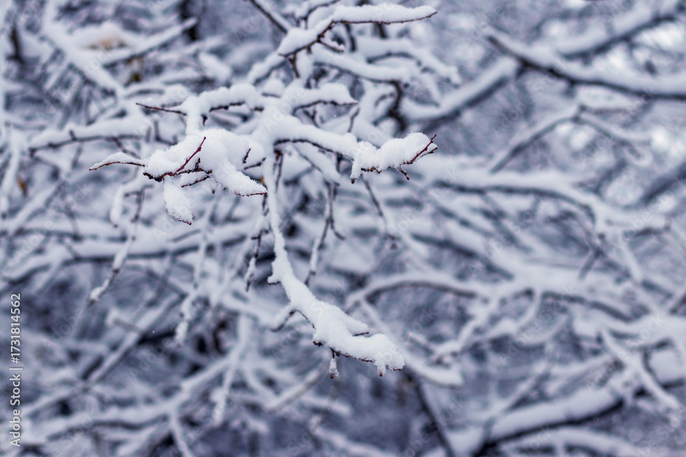 Snow-covered tree branches in the foreground against the backdrop of a snow-covered winter forest