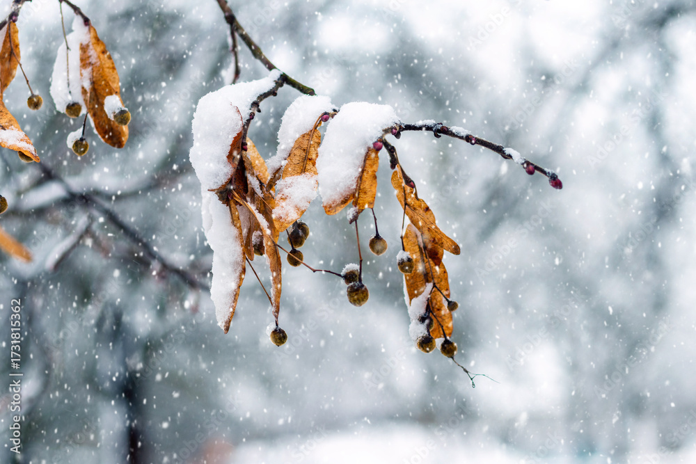 Close-up of a branch with dry leaves and seeds under a layer of snow during a snowfall