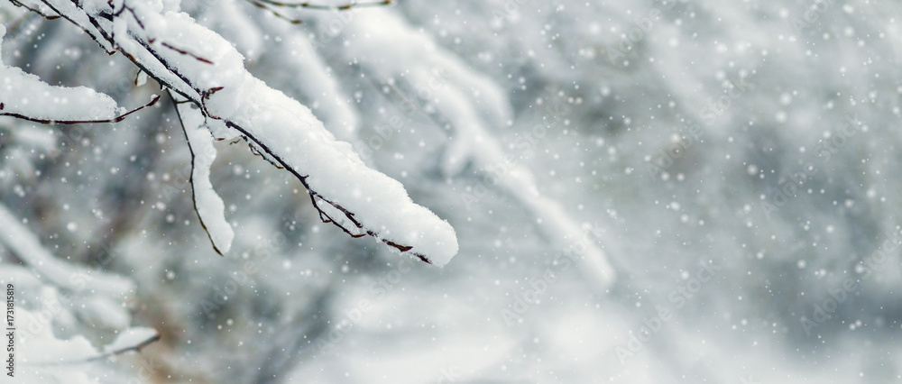 A close-up of a snow-covered branch during a heavy snowfall against the backdrop of a blurred winter forest, creating a calm mood and atmosphere