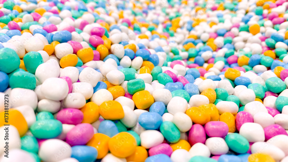 Close up colorful decorative stones, small shiny pebbles in bright pastel colors, background texture for design and decoration.