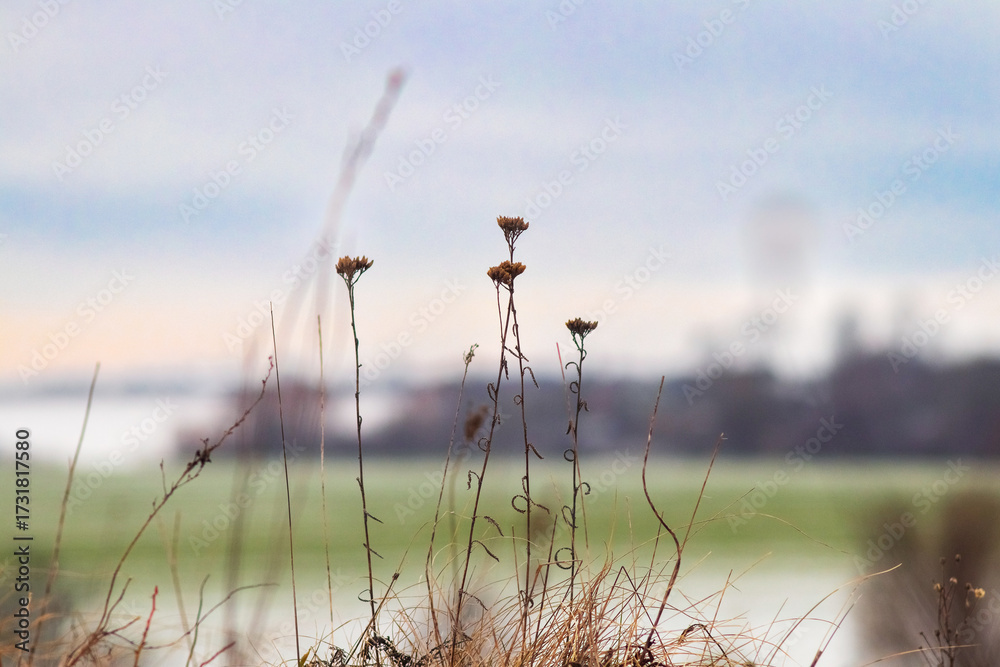 Withered plant stalks in the foreground against a winter landscape with a hill covered with snow and greenery