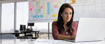 Professional woman working on laptop in office, horizontal view photography