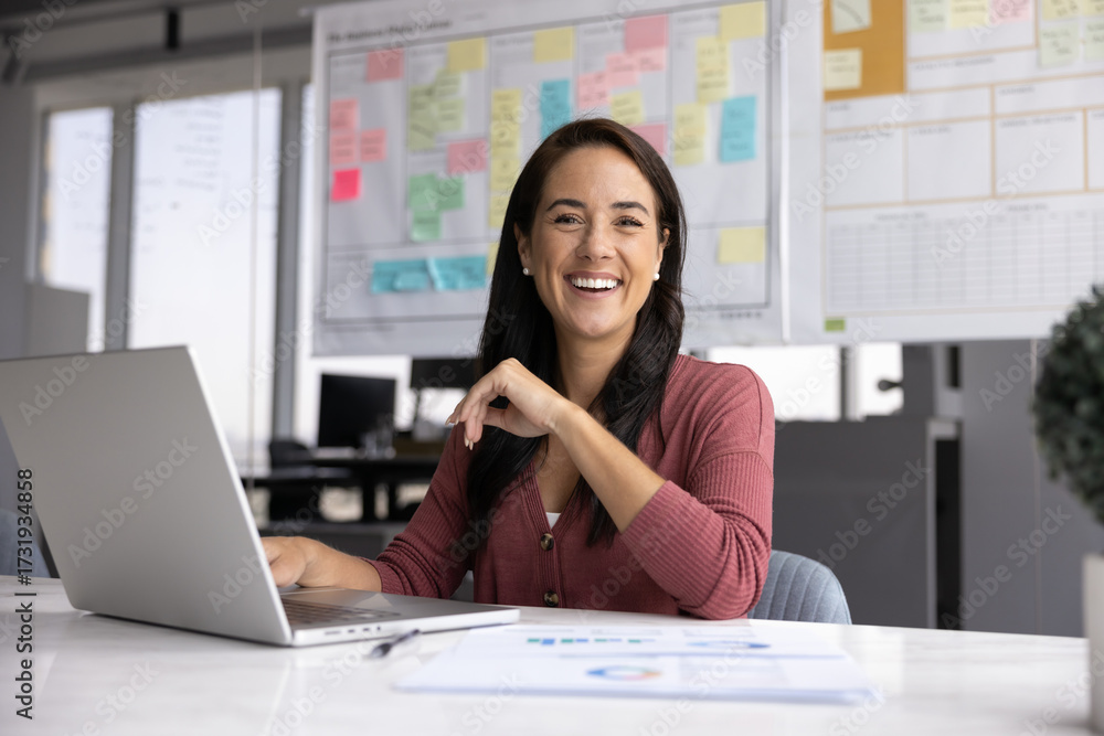 Businesswoman sit at desk, smile at camera while using laptop