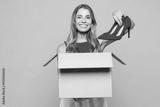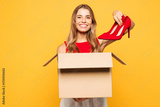 Young woman wear red casual clothes hold in hand paper package bags after shopping take high heels shoes out from box show isolated on plain orange yellow background Black Friday sale buy day concept