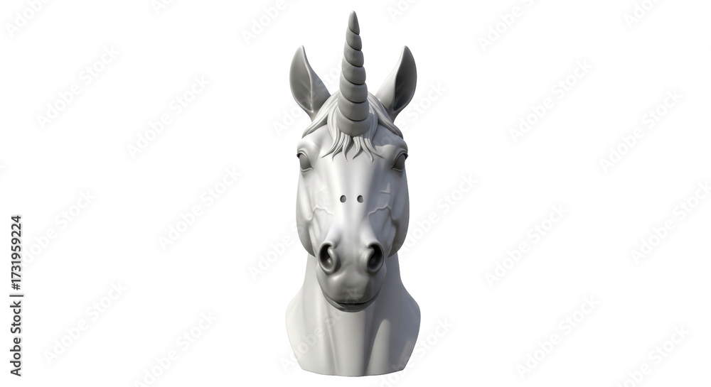 Isolated bust of a unicorn with a spiral horn on a solid backdrop casting slight shadows