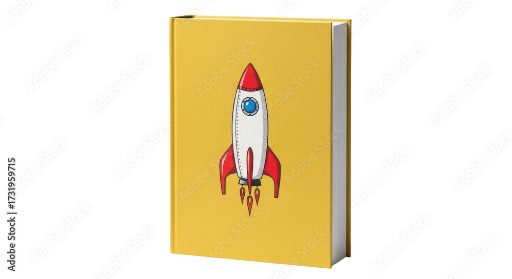Isolated yellow book with a cartoon rocket ship, ready for learning or creative projects