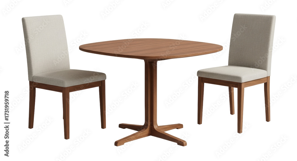 Isolated dining set of square table with brown tabletop and light upholstery chairs design