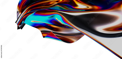 Abstract 3D illustration of flowing iridescent fabric. Features vibrant colors, smooth gradients, and a sense of motion. Perfect for design and