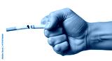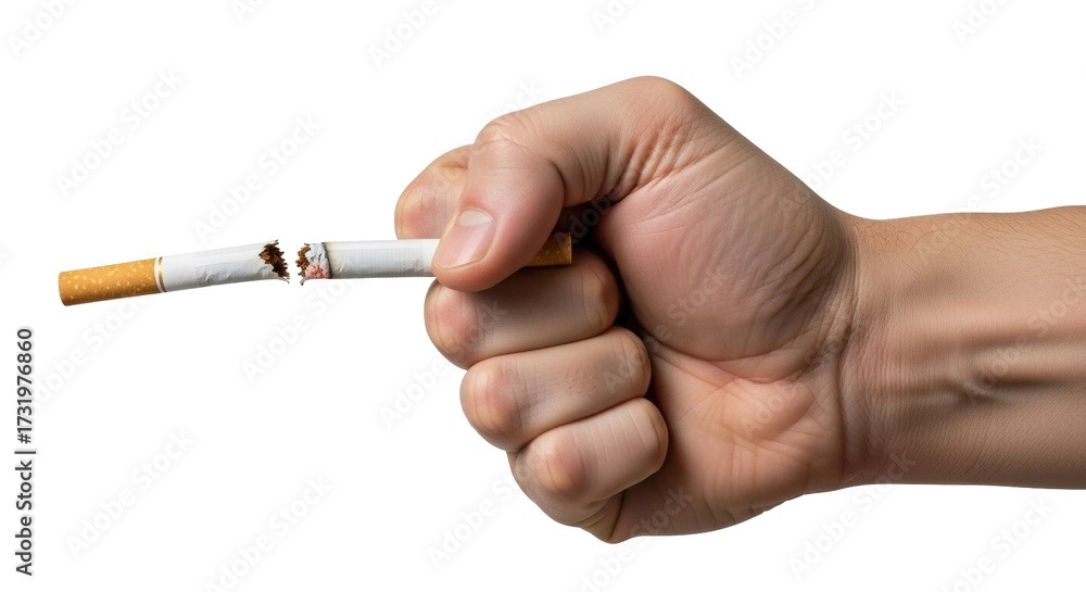 Isolated man breaks a cigarette in his hand, stopping smoking and fighting addiction