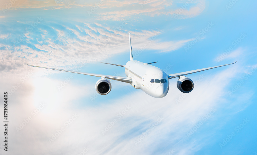 White passenger airplane flying in the sky amazing clouds in the background - Travel by air transport