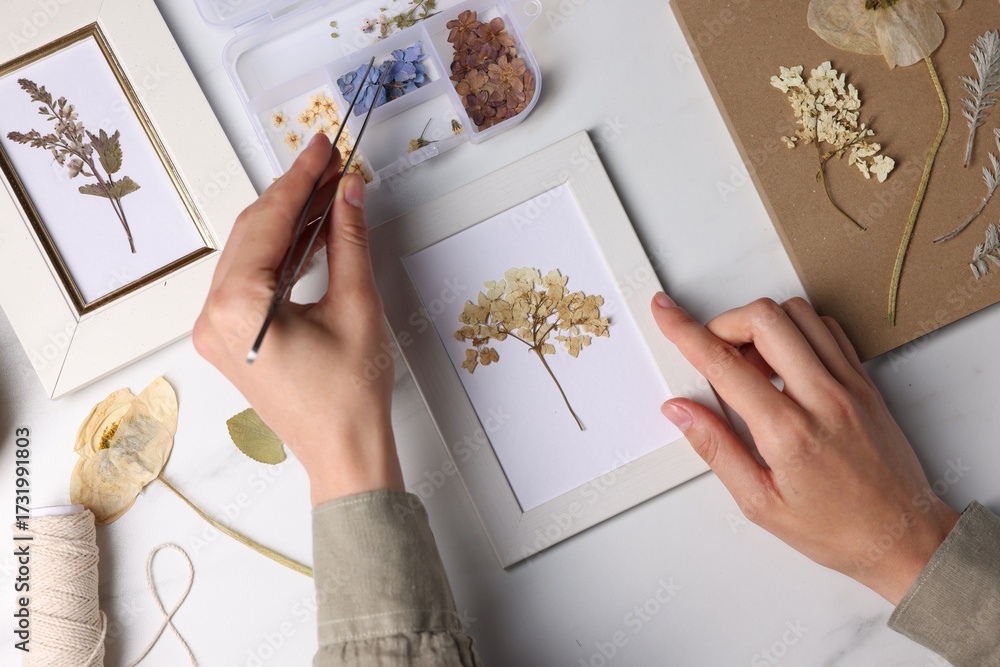 Woman putting dry flowers into picture frame at white marble table, top view