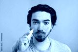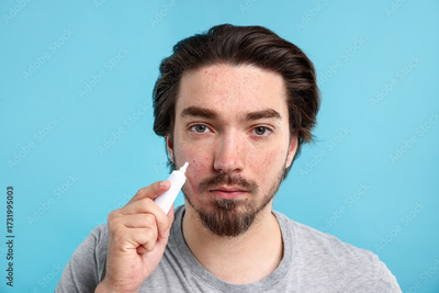 Young man with acne problem applying cream onto his face on light blue background