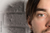 Man with beautiful eyes near light grey textured wall, closeup. Space for text