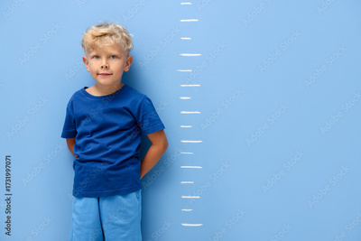 Cute little boy measuring his height near blue wall. Space for text