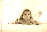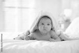 Cute baby covering with yellow towel after bathing on bed, closeup. Space for text