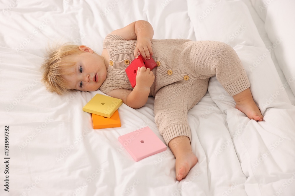 Cute baby with toys lying on white blanket