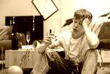 Man with glass of alcohol suffering from hangover on floor in messy room after party