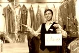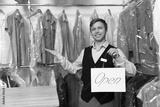 Dry-cleaning service. Happy worker holding Open sign at near rack with clothes indoors