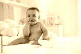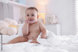 Cute baby with white towel and teether after bathing on bed at home, space for text